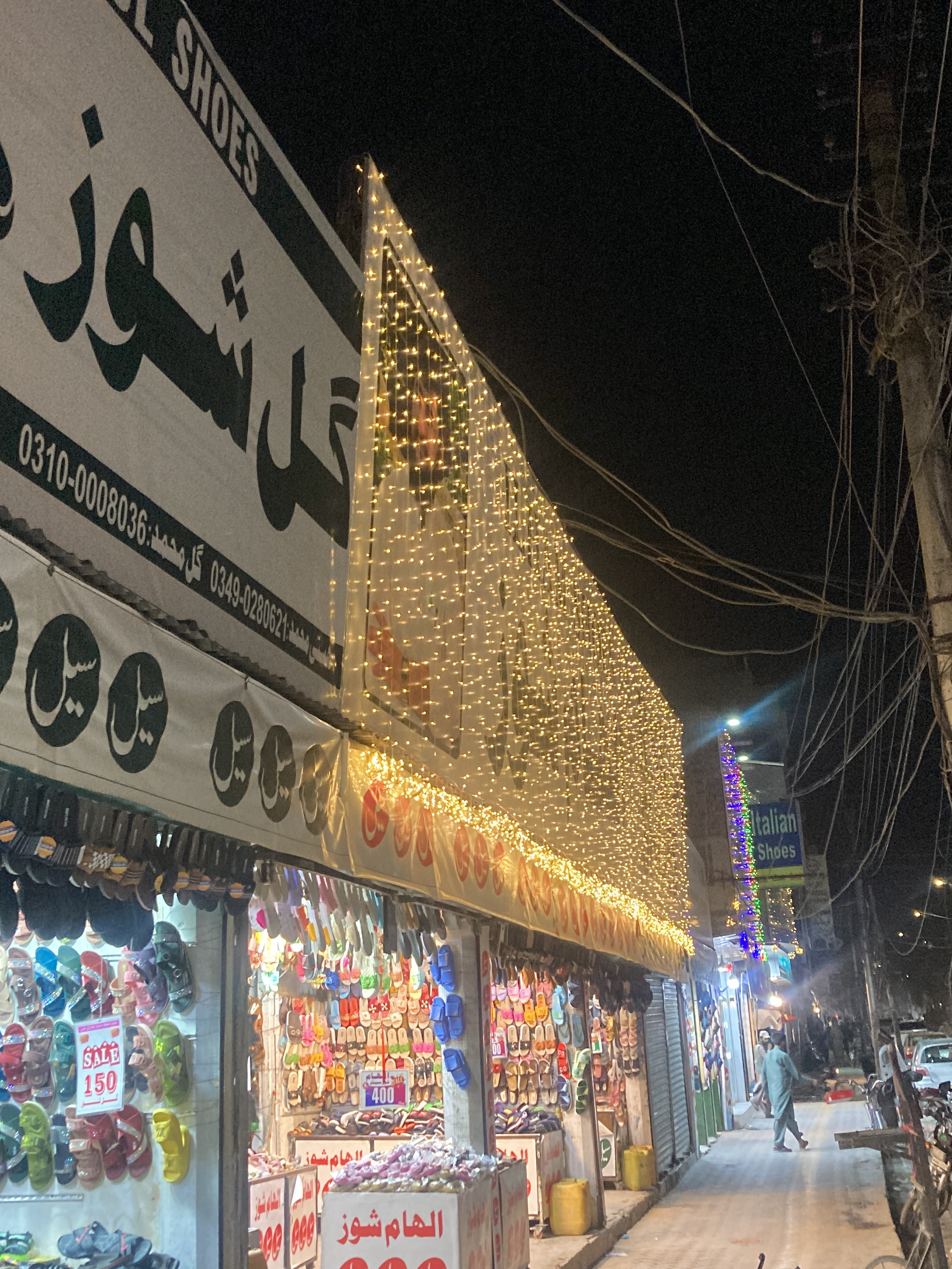 Here is a detailed description of the image: **General Overview:** The image captures a nighttime street scene in what appears to be Quetta, Pakistan, judging by the Urdu script and visible store signs. The focus is on a street lined with shops, particularly shoe stores, which are illuminated with bright, decorative lights. **Shops and Storefronts:** The shops are densely packed along the street. The store signs are prominently displayed in Urdu and English. One noticeable sign reads "گل شور" and "SHOES" with the phone numbers 0310-0008036 and 0349-0280621. Another sign indicates “Italian Shoes”. Many of the storefronts are adorned with strings of yellow lights, creating a festive atmosphere. Shoes, primarily sandals and slippers, are displayed both inside and outside the shops, hanging from hooks and shelves. “SALE 150” is advertised on a small sign on the left, while another indicates “400” with Arabic text. **People:** A few people are visible in the background. A man dressed in traditional clothing is walking down the street. Additional figures are faintly discernible, suggesting that the street is somewhat busy. **Street and Environment:** The street is an open-air market area with shops lining both sides. Utility poles and tangled wires are noticeable on the right side of the frame. Parked motorbikes and possibly a car are present. **Lighting and Decoration:** The entire scene is illuminated by artificial lighting, primarily from the storefronts and decorative light strings. The yellow lights contribute to a warm, vibrant ambiance, highlighting the commercial activity of the area.