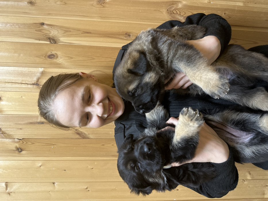 A young woman smiles, lying on her side against a light brown wood wall. She is holding two German Shepherd puppies in her arms. One puppy, light gray with black features, rests in her left arm. The other puppy, mostly black with gray markings, is held in her right arm. She is wearing a dark-colored, long-sleeved garment. The puppies appear relaxed and content in her embrace.