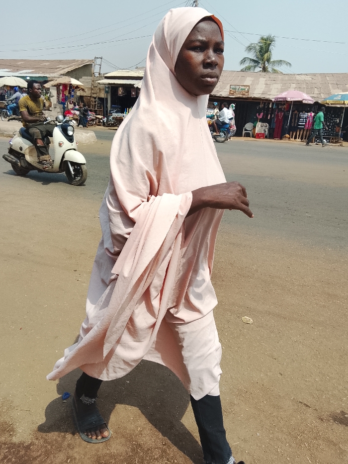 The image depicts a daytime street scene in Akwanga, Nigeria. In the foreground, a dark-skinned individual, appearing female, walks from left to right on a dirt shoulder adjacent to a paved road. This individual wears a light peach-colored hijab that covers the head and extends down the body. Black leggings or trousers are visible beneath the garment, and black sandals with a silver-colored anklet on the left foot are worn. The person's right hand is visible, positioned in front of the body with fingers slightly curled downwards. The individual looks towards the right with a neutral expression. In the midground, on the paved road to the left of the foreground subject, a man in a dark green shirt and light trousers rides a white scooter or moped, moving or stopped facing away from the camera. The background reveals a bustling urban environment. To the left of the road, behind the scooter, are more individuals, structures with corrugated metal roofs, and what appear to be market stalls. To the right of the road, a line of single-story market stalls or shops with corrugated metal roofs display merchandise, including clothing on mannequins. Several colored umbrellas, including a prominent purple one, provide shade for these stalls. Multiple individuals are visible near these shops, some walking, others standing. A palm tree rises above the structures in the distance. The sky is clear and light blue. Strong sunlight casts distinct shadows.