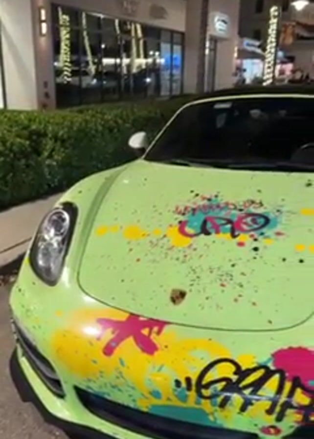 At night, a brightly colored, lime green Porsche Boxster convertible sits parked on a street lined with palm trees. The car's hood has graffiti-style art in yellow, pink, blue, and black. The driver's side headlight is visible. The car is parked near a sidewalk with decorative shrubs, and in the background, there are lighted storefronts. Other cars are visible in the distance along the street. The camera slowly zooms out, showing more of the car and its surroundings.