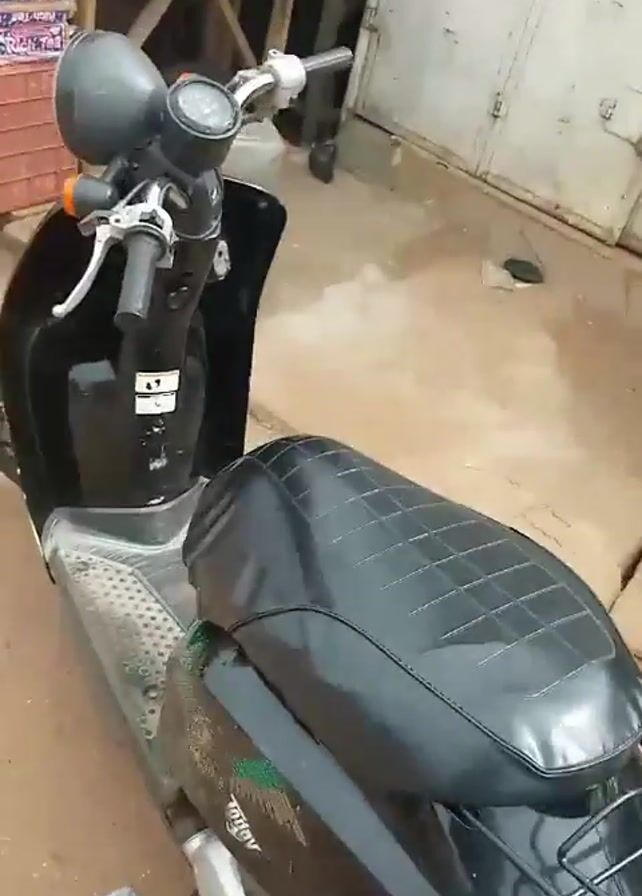 quick scan of an outdoor setting in front of a small shop. The camera begins focused on the back of a black motor scooter parked in front of what appears to be a small, informal storefront. The shot pans up and to the right, revealing the front of the scooter and then the wide variety of breads, cookies, and snacks displayed for sale in the shop. The camera then briefly moves to the side, showing more of the street and items for sale next to the store. The overall impression is of a typical roadside shop in a developing country.