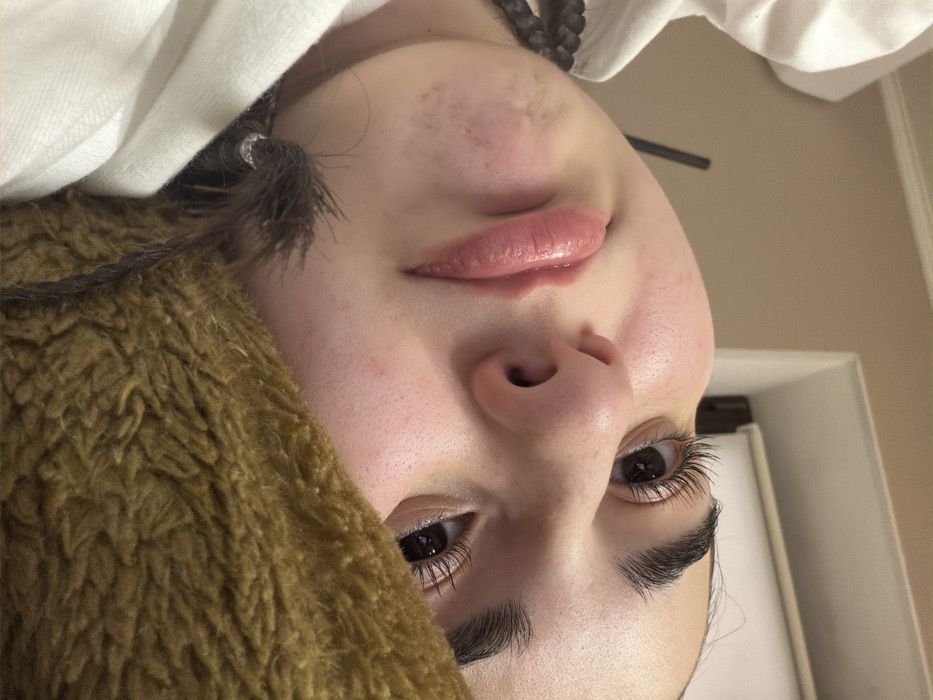 An individual is depicted in a close-up, angled portrait taken from an elevated perspective within an undetermined indoor location in the city of Unknown, Unknown. The subject, appearing female, is lying down on their back, head tilted, with their face directed towards the viewer. The face occupies the central and majority portion of the frame. **People:** One person. The individual has fair skin, visible pores, and areas of redness on the cheeks. The left side of the face (viewer's left) exhibits several shallow, irregular depressions consistent with scarring. Dark, full eyebrows frame dark irises, which are looking upwards. Long, curled eyelashes are prominent. The lips are full, glossy, and a light pink/peach color, slightly parted. **Subjects:** The primary subject is the individual's face, shown from the nose upwards and across to the left cheek and chin area, with part of the forehead visible. **Objects:** * A white garment, possibly a hoodie, is visible on the upper left, partially covering the shoulder and neck. * A dark, multi-strand beaded necklace is visible against the white garment on the left side. * A textured, medium-brown, soft material, likely a pillow or blanket, is visible in the lower right, supporting the individual's head. * Strands of dark hair are visible, some with a small, silver-colored ring or clip, near the bottom left of the frame, partially obscured by the brown material. **Actions:** The individual is resting in a reclined position, with their gaze directed upwards towards the camera. **Interactions:** There are no explicit interactions depicted within the frame. **Environment:** The background consists of a plain, light beige or tan-colored wall. A white trim or doorframe is visible on the right side. The lighting appears to be soft and ambient, consistent with an indoor setting.