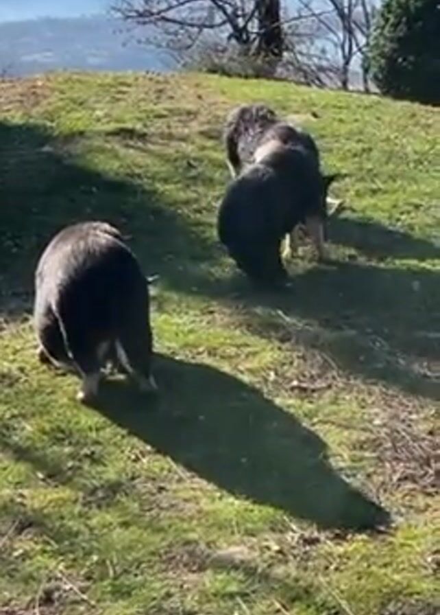 three large, stocky black pigs foraging on a grassy hillside. In the background, trees and a distant body of water are visible. The sun is shining, casting shadows on the grass. The pigs are moving around, sniffing and rooting in the grass. One of the pigs interacts with the two other pigs.