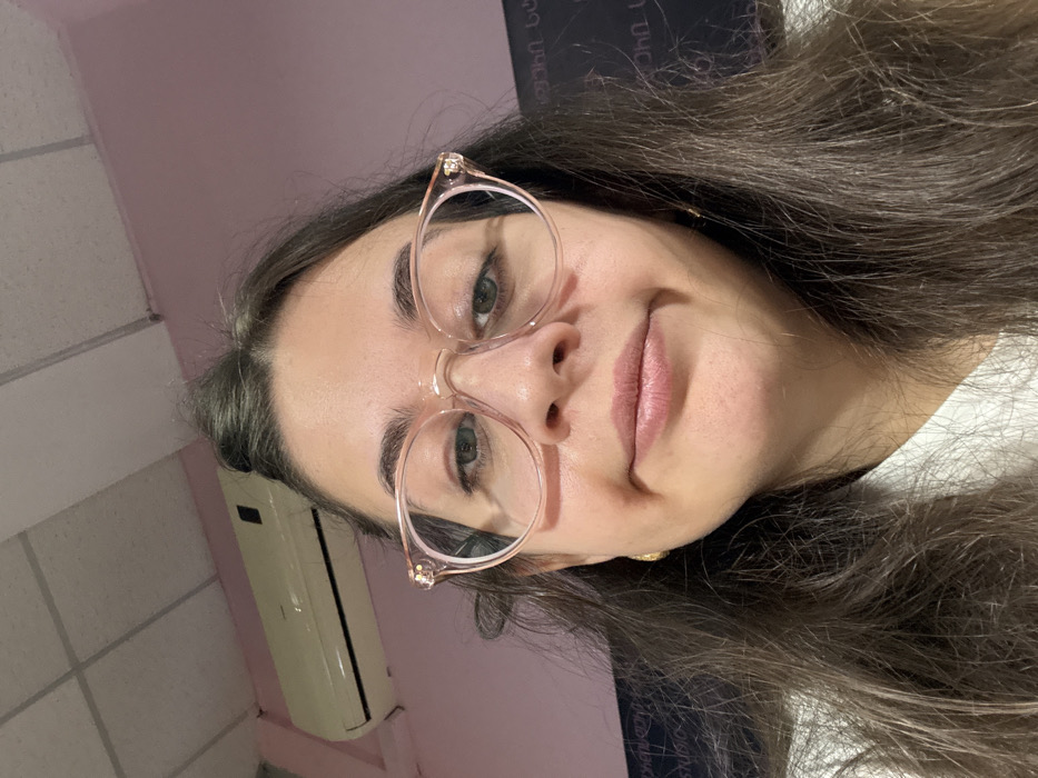 A single female subject is depicted indoors, framed from the mid-chest upwards, capturing a selfie-style perspective. She has long, dark brown hair, light-colored eyes, and wears light pink, clear-rimmed glasses. A small, gold-colored earring is visible on her right ear. She wears a white top and displays a subtle, neutral expression with slightly pursed lips. The background features a light pink wall, upon which a white split-system air conditioning unit is mounted on the upper left. A grid-style drop ceiling with white panels is visible at the top of the frame. To the lower left, behind the subject's left shoulder, a dark surface, possibly a chalkboard or screen, displays partially visible white Georgian text. Notable visible words include "სტუდიო" (studio) and parts of other words such as "თბილისის" (Tbilisi's), confirming the location as a studio or commercial space in Tbilisi, Georgia.