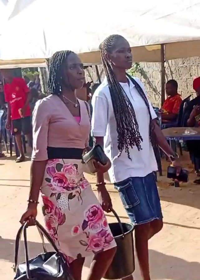 Two women are walking on a sandy, outdoor area. The woman on the left wears a pink blouse, a floral skirt, and black flats. She carries a black tote bag. The woman on the right wears a white t-shirt, denim shorts, and sandals. She initially carries a black bucket, then later a black purse. Both women have their hair styled in braids. They walk past tents, chairs, and other people. The environment appears to be a gathering or event, possibly outdoors.