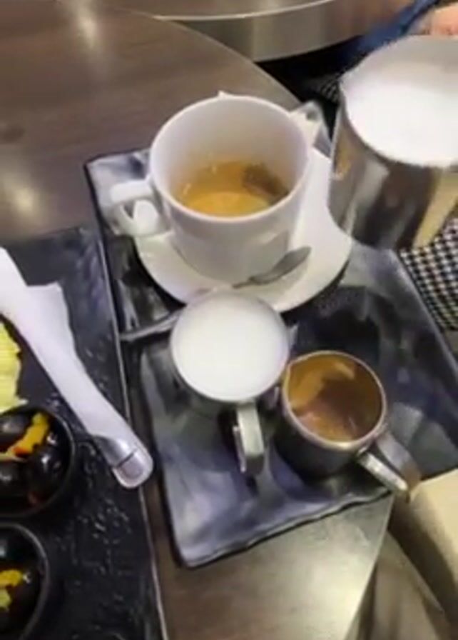 person adding milk to a cup of espresso. The espresso is in a white cup on a white saucer, which sits on a small black serving tray. Two small metal pitchers are also on the tray, one with more milk, and the other with espresso. To the left of the tray is a black rectangular plate with what looks like a salad. The table the food is on appears to be dark wood. The person pouring the milk is wearing blue jeans and what looks like a black and white checkered jacket.