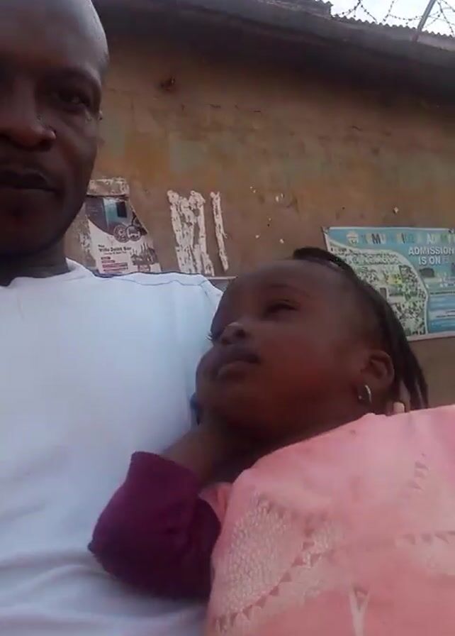 man holding a young child in his arms. The man is bald and wearing a white shirt. The child has dark hair styled in braids with beads. She is wearing a pink shirt with long, maroon sleeves. The background shows a wall with posters and barbed wire along the top. The sky is overcast. The child occasionally looks up, and the man looks at the camera.