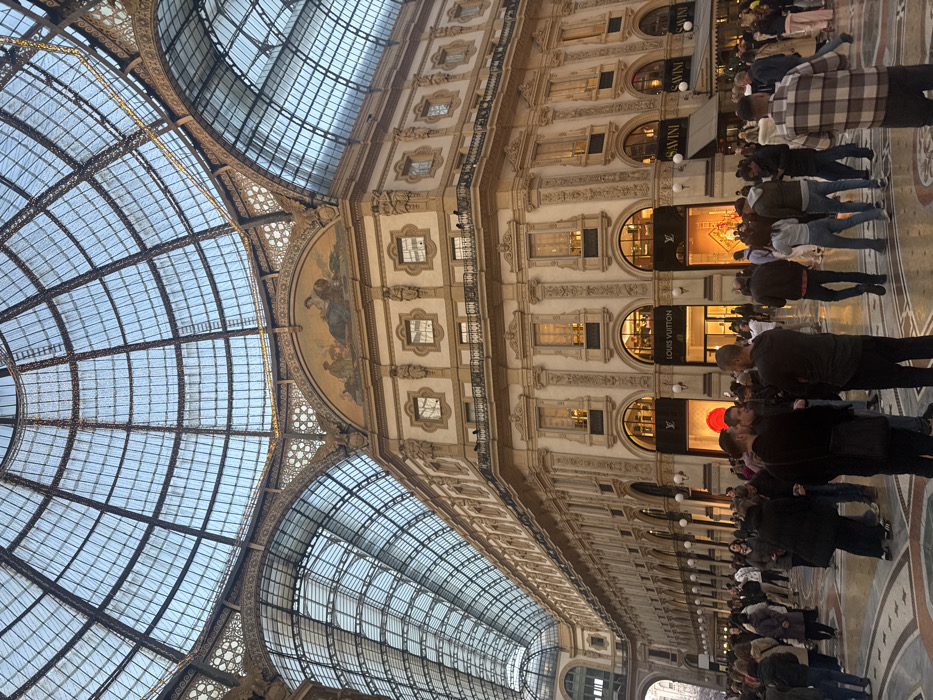 The image captures the interior of the Galleria Vittorio Emanuele II in Milan, Italy