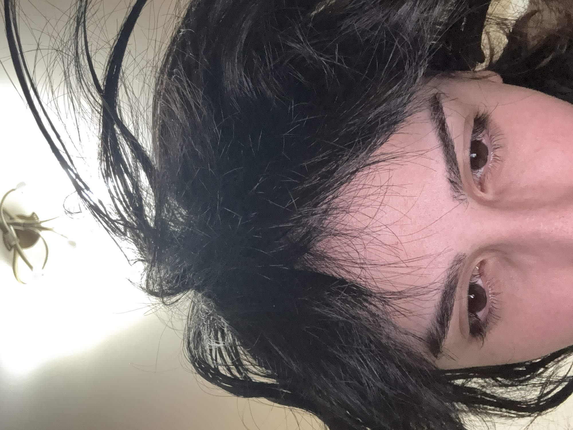 The image presents an upward-angled close-up of an individual's upper face, primarily showing their eyes, eyebrows, and forehead. The subject has dark, disheveled hair that extends upwards from the head, partially obscuring the upper forehead. Both dark brown eyes are open and directed downwards. Dark, thick eyebrows are visible above the eyes. The skin tone is fair. In the upper background, a light-colored ceiling is visible, featuring a bright, partially rendered decorative light fixture. The environment is an indoor setting. There are no identifiable visual elements within the image to specify a location in the city of Yerevan, Armenia.