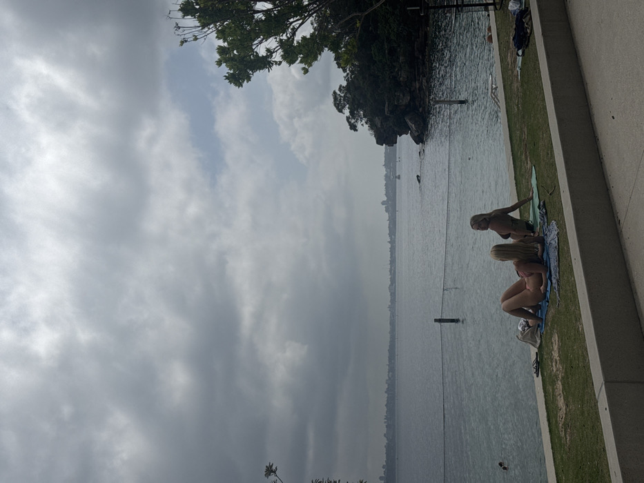 The scene depicts Parsley Bay Reserve in Vaucluse, Australia, under an overcast sky featuring dense grey clouds with a small segment of blue sky visible in the upper right. A calm, dark-toned body of water, consistent with Sydney Harbour, occupies the midground, with a distant urban skyline discernible across the water. A netted swimming enclosure, delineated by vertical wooden posts and a visible mesh barrier, is present in the water. On a grassy bank adjacent to the water, two blonde-haired individuals are observed. One individual is lying prone on a blue towel or mat, dressed in a light-colored bikini. The second individual is seated upright on a light green mat, wearing a dark bikini, oriented towards the left. Personal items including a light-colored bag, dark flip-flops, and dark clothing are situated near these individuals. In the far-left section of the water, a third individual is partially submerged and appears to be swimming. The right side of the image features a rocky headland densely covered with green trees and foliage, extending into the water. A concrete structure or path borders the immediate foreground.