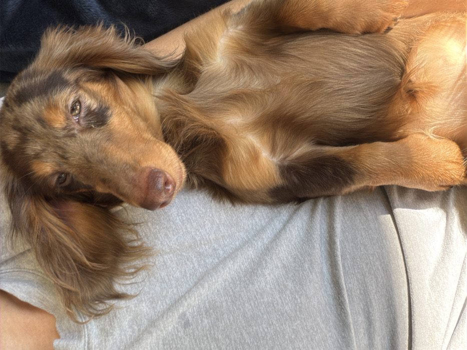 - "A long-haired dachshund lies on its back on a light gray surface" by FM-yQ80S2, licensed under CC BY 4.0