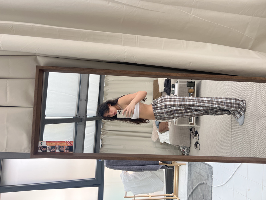 An indoor residential scene in Milan, Italy, depicts a young female capturing a full-length mirror selfie. The individual, with long dark hair, stands in profile, facing left, wearing a white bralette-style crop top, brown and white plaid pajama pants, and light grey socks or slippers. She holds a white smartphone in her right hand, directed at the dark-wood framed mirror. The mirror's reflection shows a bedroom setting behind the subject, which includes a bed with light-colored, disheveled bedding, a small side table holding dark objects, and beige curtains. Above the curtains, a dark metal structural beam is visible, suggesting a modern or loft-style architectural element. A strip of small photographs with the visible text 'CHRISTMAS VINTAGE' is affixed vertically to the upper left side of the mirror frame. To the left of the mirror, the unreflected area of the room features a large window with dark frames overlooking an indistinct exterior. A wooden clothing rack holds a grey and a white towel. The floor is tiled and includes a dark grey rectangular mat and a white cable running along it.