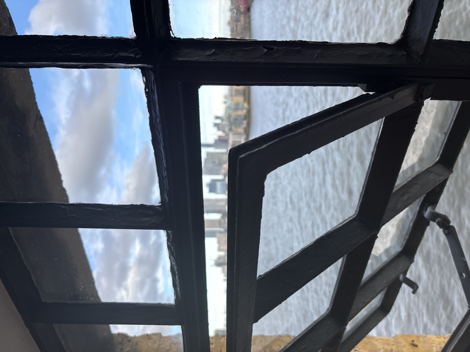 - "The image displays an exterior view through a heavily barred window from within a stone structure, identified as the Tower of London, overlooking the River Thames in London, United Kingdom" by FM-0xFq33, licensed under CC BY 4.0