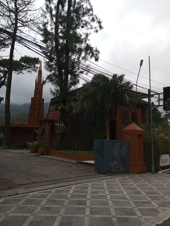 An exterior scene depicts a building complex under an overcast sky in the city of Boommlog, Bhutan. The foreground features a light and dark gray checkerboard paved sidewalk, adjacent to a darker, rougher paved driveway leading into the property. To the left, a tall pine tree stands in front of a multi-tiered reddish-brown brick tower, which culminates in a golden, pointed spire. Utility lines traverse the upper portion of the frame. The main building complex, located centrally, is constructed with reddish-brown brick and dark-colored panels, heavily integrated with lush green foliage, including palm trees and climbing plants. An arched entryway is visible on the left side of the main building. A dark gray metal sliding gate with a geometric pattern, flanked by a short brick pillar, marks the entrance to the property on the right. A street light pole with an LED fixture is positioned on the right. A white sign reading "BUKA" is partially visible near the gate on the right, and another dark sign with partial text, including "M", "ATT", and "TERBUK...", is seen further right. Distant mountains shrouded in haze are visible in the background behind the tower. No individuals are present.