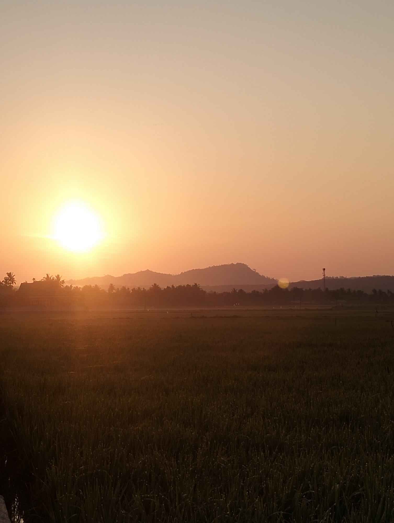 The image displays a rural landscape at sunrise in Meunasahalue, Indonesia. The sky transitions from a bright yellow-orange around a prominent, brilliant sun in the upper left, fading to a pale orange and light grey-orange towards the top. A range of dark, silhouetted mountains forms the distant horizon. In the midground, below the sun, a large, dark-silhouetted building with a pitched roof is visible, surrounded by palm trees and dense vegetation. To the right of the scene's center, a tall, slender, dark tower structure stands against the illuminated sky. The lower two-thirds of the image are occupied by a vast field of dark green, slender-bladed crops, consistent with rice, with numerous small, reflective dew drops visible on individual plant blades, indicating an early morning setting. No individuals or discernible actions are present within the scene.