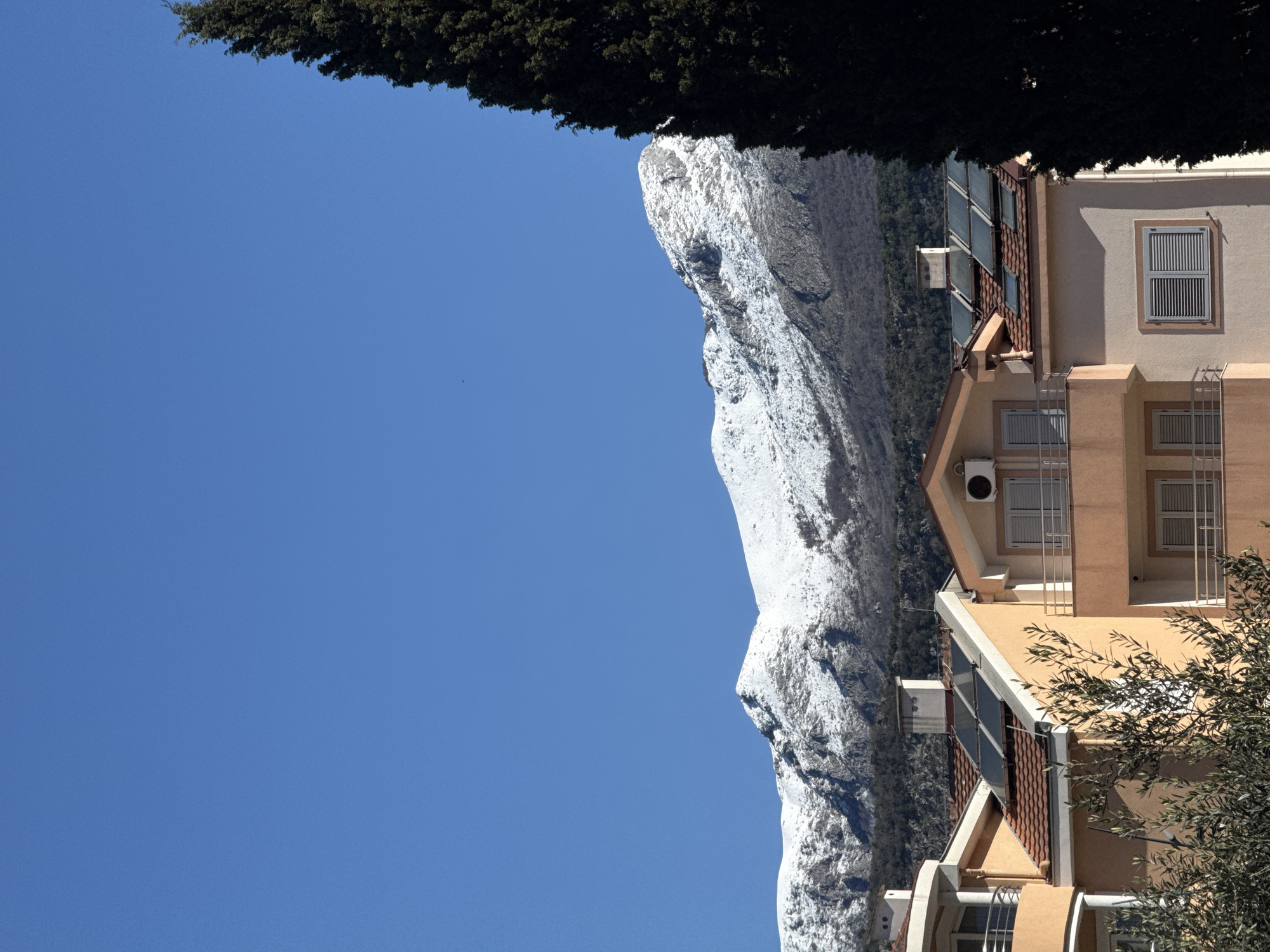 The image captures a scene in Budva, Montenegro, featuring a juxtaposition of natural and man-made elements. A clear blue sky dominates the left side of the image. To the right of the sky, a snow-dusted mountain range rises, appearing rocky and rugged. Adjacent to the mountains, a multi-story building is visible, displaying a combination of beige and brown hues. It features windows with metal grilles, air conditioning units, and a tiled roof section. A tree with leafy branches partially obscures the building on the lower right. At the top of the image, a dense, dark green foliage stretches across the frame.