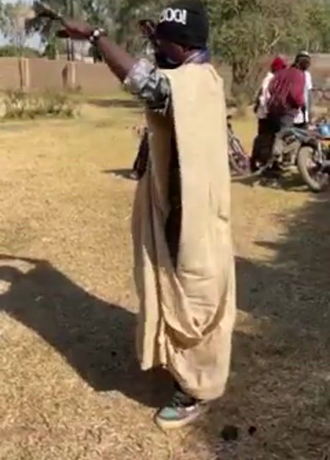 A man wearing a black beanie, a tan robe, blue jeans, and sneakers is seen dancing in a grassy area. He is wearing a face mask and a scarf around his neck. Behind him are other people and a motorcycle. In the background, there are trees, a wall and a building. The man moves his arms and dances in place, appearing to enjoy himself. The environment looks like a rural village.
