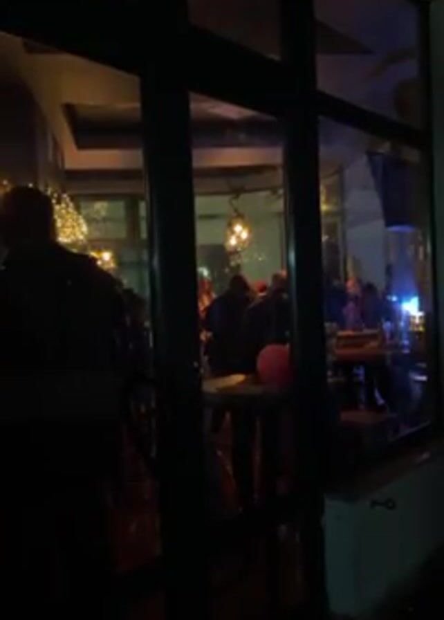 interior of a bar or restaurant as viewed through a window at night. Several people are inside, standing and sitting at tables. There appear to be lights strung up, possibly for decoration. The window frame is dark, and the view is slightly obscured by reflections and the dim lighting inside. The scene appears lively with a group of people socializing.