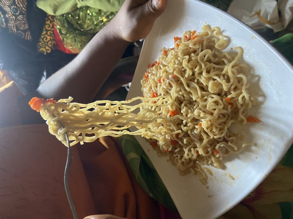 A person holds a fork with noodles in their left hand, lifting them away from a white, square plate filled with more noodles and small, diced red vegetables. The noodles appear to be a light tan color, possibly with a sauce. The background shows colorful fabrics and clothing, suggesting an indoor setting. The focus is on the noodles being lifted from the plate.