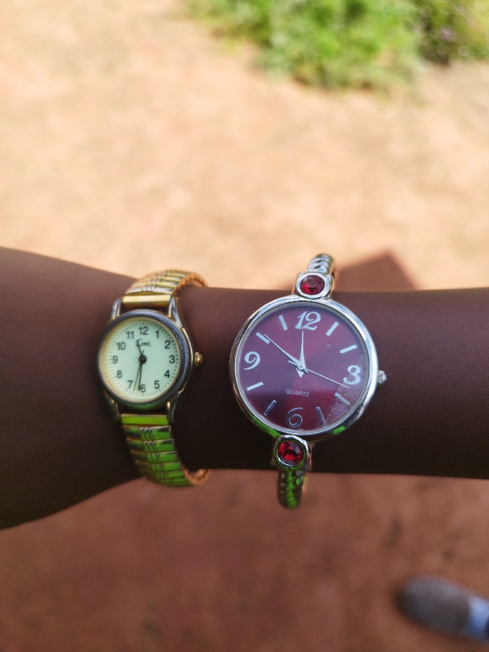 Two analog wristwatches are on a brown arm. The first watch has a gold band and a silver face with black numerals. The time displayed on the watch is approximately 10:09. The second watch has a red face with silver numerals and hands. The band is silver and features red jewels. The time displayed on the watch is approximately 10:00. The background is blurry, with hints of green and brown.