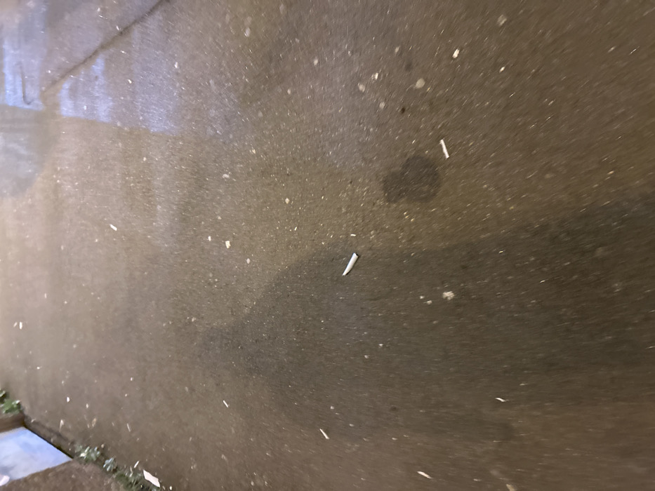 A dark, weathered concrete surface fills the frame. It is speckled with small, white debris. The surface appears damp in sections, creating darker and lighter patches. A small, dark stain is visible near the center. Along the bottom edge are fragments of stone and greenery. A faint reflection of light is seen in the upper left, suggesting a nearby structure.