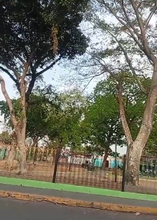 park surrounded by a black fence. There's a yellow and green curb separating the park from the street. Several tall trees with green leaves are within the park. One person walks by in a blue shirt and another rides a motorcycle past the park. A white car drives by further down the road. The sky is overcast.