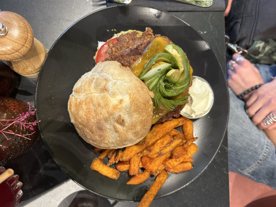 The image presents a close-up, overhead view of a dining table at what appears to be a restaurant. A large, round, matte black plate occupies the center, holding a burger and a side of sweet potato fries. The burger features a light-colored, crusted bun, a thick, dark-brown patty (appearing plant-based), a slice of orange melted cheese, a thin red tomato slice, and fan-arranged avocado slices atop a light green spread. A pile of bright orange sweet potato fries, some visibly salted, is to the left of the burger. A small, round, metallic ramekin containing a white creamy sauce is positioned below the fries. In the upper left background, a portion of a glass with a dark red liquid is visible. Next to it, a dark red, textured glass vase contains dried pink or purple floral stems. To the upper right, a wooden salt or pepper grinder with a silver top is present. The tines of a silver fork are partially visible on the plate's right edge. In the lower foreground, a person's legs, clothed in blue denim jeans, are visible. The person's left hand, adorned with multiple silver rings on the index, middle, and ring fingers and a dark beaded bracelet on the wrist, rests on their lap. The table surface is dark, possibly black or charcoal gray, with subtle reflections. The specific location within Hamburg, Germany, is not discernible from the visual information provided.