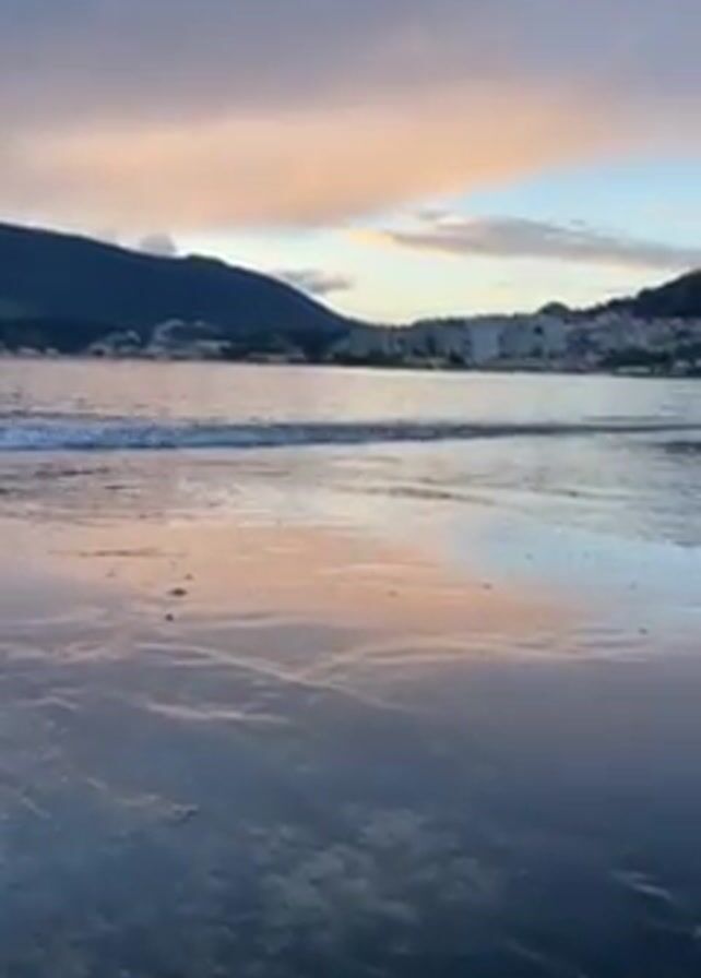 coastal view at dusk. The water is calm with small waves washing onto a dark-colored beach. In the distance, there are mountains on the left and a town or city on the right, both silhouetted against the sky. The sky displays a mix of colors including blue, grey, pink, and orange from the setting sun. The wet sand on the beach reflects the colors of the sky.