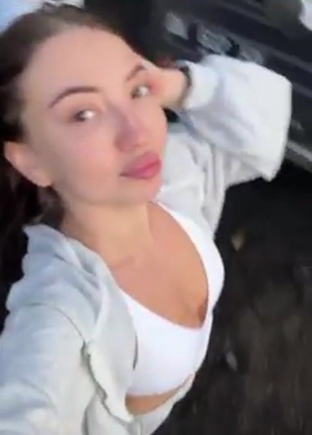 A young woman films herself in a selfie-style video. She is wearing a white sports bra and a light gray zip-up hoodie. She has long brown hair and is smiling at the camera. Behind her, there's a red off-road vehicle with several other people on and around it. One person is sitting on the roof of the vehicle. The background is a landscape with trees and a slightly cloudy sky. The camera angle is slightly tilted and moves as the woman moves.
