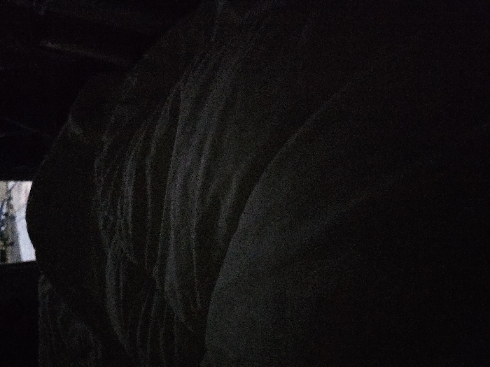 The scene depicts an interior environment, located in Dupnitsa, Bulgaria, under conditions of extreme low illumination. The majority of the frame is filled by a dark, textured fabric, consistent with a blanket or duvet, which displays numerous folds and contours across its surface. In the upper portion, a blurry, rectangular aperture is visible, through which an indistinct, distant light source or exterior view is perceived. This exterior element provides minimal discernible illumination to the background. Dark, undefined structural masses are present on the left and right sides of this aperture. No individuals, specific actions, or interactions are discernible within the image.