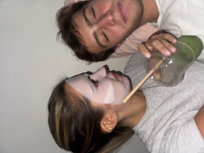 This indoor scene depicts two individuals in a domestic setting, located in Eindhoven, Netherlands. A female, positioned in the upper portion of the frame, has light brown hair with highlights, pulled back. Her face is covered by a light-colored sheet mask, and she wears a grey t-shirt. Her visible left ear features a small gold stud and an ear cuff. Her right hand, exhibiting light pink polished nails, holds a transparent plastic cup filled with a green beverage and containing a light-colored straw. She is leaning over a male individual who occupies the lower portion of the frame. The male has dark, curly hair, wears a white t-shirt, and appears to be resting or sleeping with his eyes closed. His head rests on light pink bedding or upholstery. The background consists of a plain, light-colored wall. The interaction suggests a moment of shared relaxation or personal care.