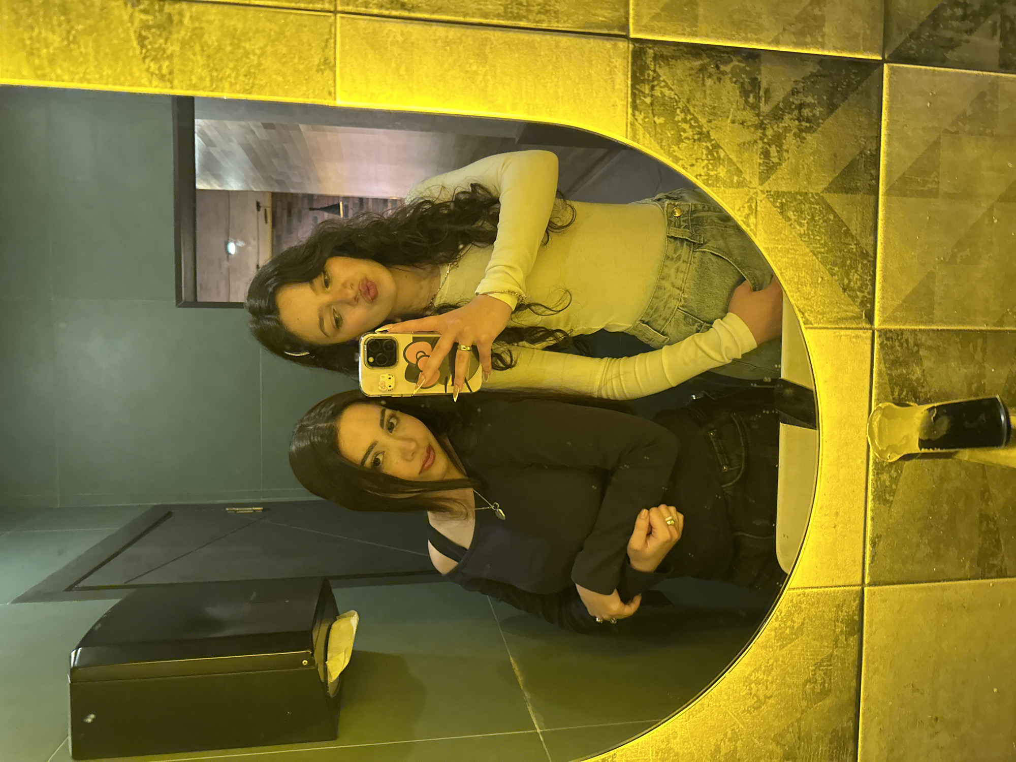 Two young women are taking a selfie in the mirror of a public restroom. One woman is holding a phone in front of them with a light yellow phone case with a pink flower. The woman holding the phone has long curly dark hair, and she is wearing a long-sleeved light green shirt and light blue jeans. Her mouth is puckered in a kiss. The second woman has long straight dark hair and is wearing a long-sleeved black top with a portion of her shoulder exposed. She is holding one hand with the other in front of her chest. The background shows a dark green wall, a tissue dispenser, and the stall door. The mirror is a large circle surrounded by yellow-gold decorative tiles. It is unknown whether the restroom is in Yerevan, Armenia.