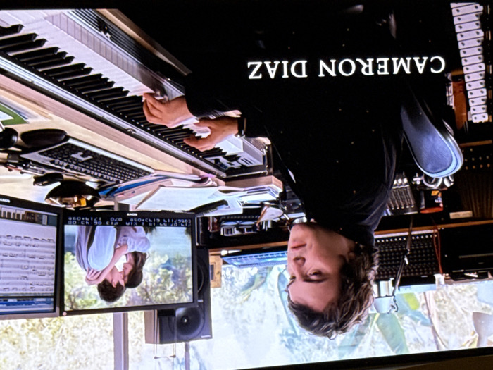 A person with curly hair plays the piano in a recording studio. Computer monitors display sheet music and a couple embracing. The desk is cluttered with musical equipment, including keyboards, a computer keyboard, and other electronic devices. "Cameron Diaz" appears as text on the screen, partially obscured by the person's jacket. The image is oriented upside down.