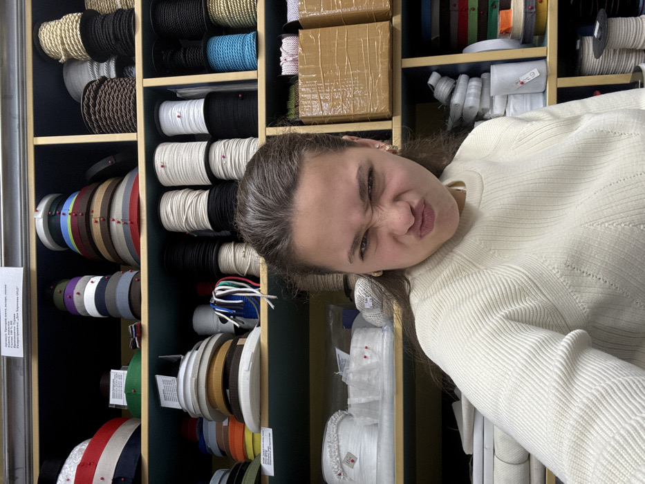 A young female individual is depicted in the foreground, capturing a self-portrait within what appears to be a textile or haberdashery store. She wears a cream-colored ribbed long-sleeve sweater and has dark hair pulled back. Her face displays a deliberate grimace, with pursed lips, a crinkled nose, and furrowed eyebrows, directed towards the camera. The background features a multi-tiered shelving unit, compartmentalized and stocked with various craft and textile supplies. The top shelf holds stacks of circular materials, likely hat stiffeners or brims, in diverse colors including white, red, blue, green, black, grey, and brown, many secured with small red pins. Adjacent to these are numerous spools of braided cord or rope in shades of brown, beige, grey, black, white, and blue. A white label at the top-left identifies products in Bulgarian as "Textile tape, cover, cotton, jacquard, workmanship," noting "Made in Turkey" and "Distributor: Don Kharkova ODD." The middle shelf contains more stacks of similar circular materials in colors such as beige, brown, white, yellow, and orange, alongside bundles of colorful cords and multiple spools of white, black, and beige ribbon or cord. The bottom shelf presents rolls of white lace trim, several brown cardboard boxes sealed with packing tape, and additional spools of colored cords in light blue, green, and pink, interspersed with plastic-wrapped white materials. Based on the Bulgarian text on the product label, the scene is located in a retail or wholesale textile supply establishment in Sofia, Bulgaria.