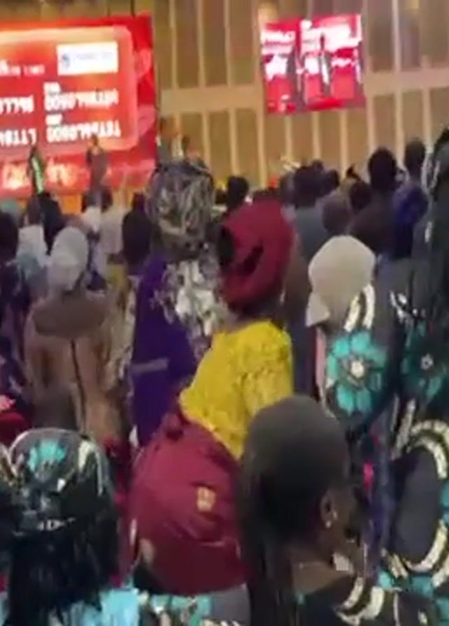 Here's a concise description of the video: The video shows a large group of people inside a building, likely a church or auditorium. Most are women dressed in colorful, traditional African clothing. They are dancing and moving rhythmically to music. A large screen in the background displays numbers and text, potentially related to donations or fundraising. The camera is handheld and moves through the crowd, capturing the energetic atmosphere.