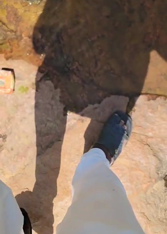 first-person view of someone walking in sandals and white pants. They are walking on rocks and through a small stream. The shadow of the person is visible, along with a small container. The ground is primarily rock and some grass. The water appears shallow and clear.