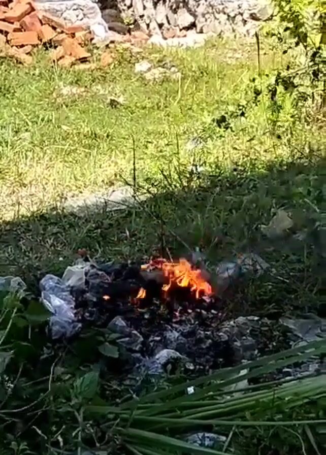 The video depicts a small fire burning in a grassy outdoor area. The fire is contained within a small pile of what appears to be trash, including some plastic bags. There's green grass and plants surrounding the fire. In the background, there are some bricks, a stone wall, and more greenery. The lighting suggests it's daytime with sunlight illuminating the scene. There are no people visible in the video.