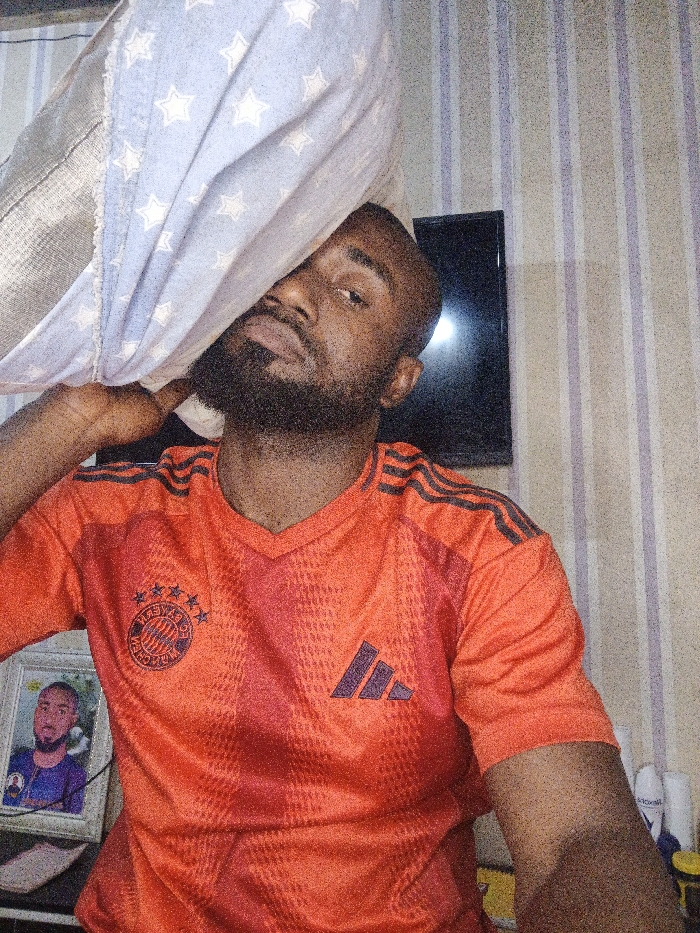 A bearded man in an orange FC Bayern Munich jersey holds a patterned pillow over his head. His face shows clearly, a TV screen is behind him. In the background, a striped wallpaper is noticeable. Also, to the left a framed photo of a person can be seen. The photo is on a bedside table with multiple objects.