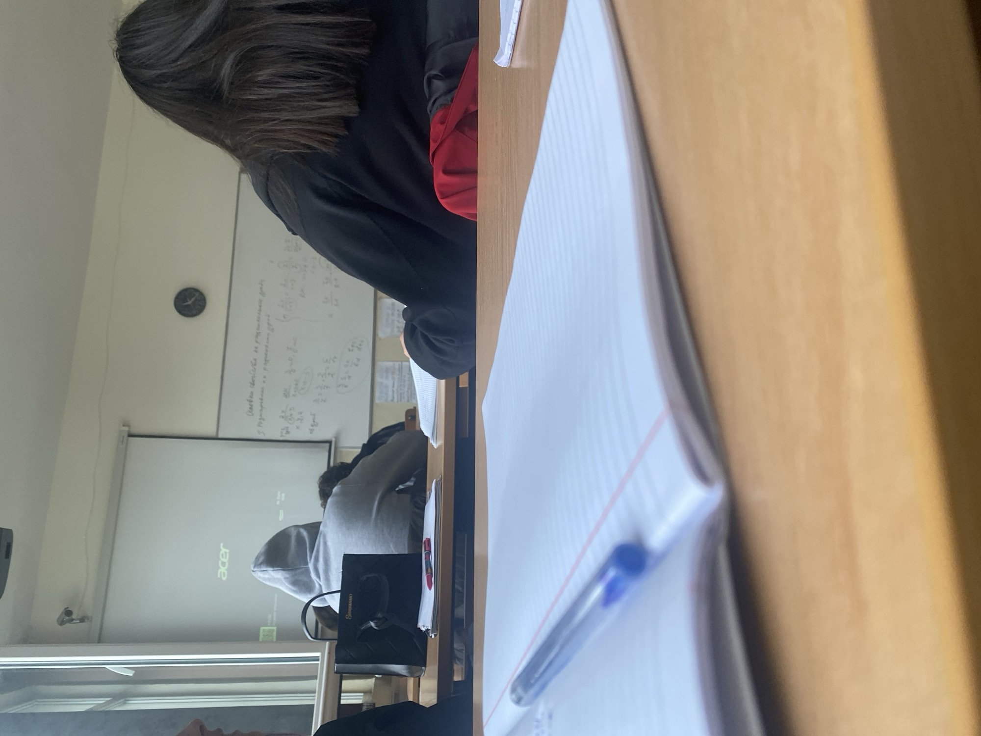 A classroom setting in Asenovgrad, Bulgaria shows several students seated at wooden desks, facing a whiteboard with handwritten notes and an Acer projector screen displaying a logo. A female student with dark hair wears a black jacket with a red lining. A notebook with lined pages lies on a desk in the foreground with a blue pen. Another student in a grey hoodie sits closer to the projector screen. Head phones are on the desk. The image is taken from a low angle.