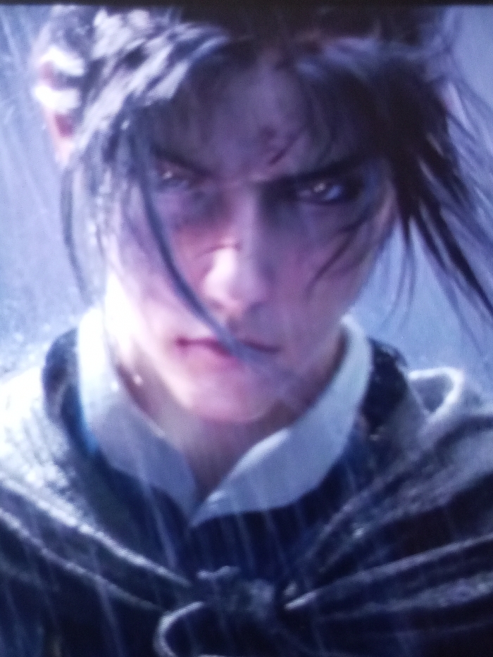 A close-up shows a person's face with an intense gaze. Their dark hair is windswept across their face, and what appears to be rain or water droplets are visible. There are small marks above their eye, possibly scratches. They wear a dark garment tied at the neck over a white collared shirt. The lighting is cool and somewhat moody, adding to the intense atmosphere.