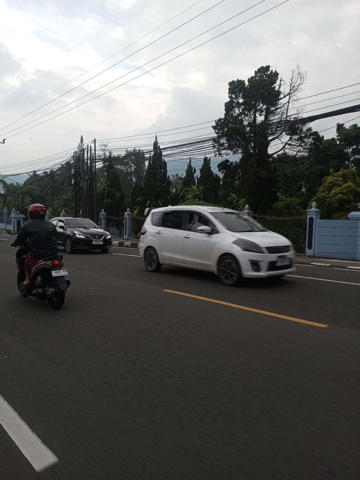 The image captures a street scene in Ciherang, Indonesia, under an overcast sky. A motorcyclist wearing a red helmet and dark clothing is in the foreground, positioned on the left side of the frame. Behind the motorcycle, a black car is present. A white car is in motion, captured with motion blur on the right side of the frame. The road is marked with a solid yellow line and a white line closer to the viewer. Trees, bushes and a blue-and-white fence run along the roadside. Utility poles with tangled power lines are visible against the sky.