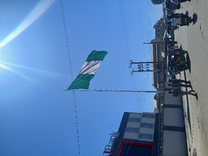 The image depicts an urban street scene in Jos, Nigeria, characterized by bright, sunny conditions and a clear blue sky. A large Nigerian flag, displaying green, white, and green vertical stripes, is prominently flown from a tall flagpole situated slightly right of the frame's center. To the left, a modern, multi-story building with a dark blue facade and white rectangular patterns features prominent "UBA Bank" signage in red and white lettering. A low, grey perimeter wall topped with barbed wire runs in front of this building. The foreground presents a dusty, unpaved or poorly maintained road surface. On the left side of the road, three adult males are present; one, wearing a plaid shirt and light trousers, is walking towards the left of the frame, while two others stand nearby. On the right side of the road, a yellow and black tricycle taxi, identified by "PTN C859", is visible. Further down the street, multiple utility poles with complex overhead wiring are evident, and the road extends into the distance, populated by additional vehicles including several motorcycles with riders (one wearing a white shirt) and cars, alongside more pedestrians. Overhead power lines crisscross the sky in the mid-ground. A strong sunbeam or lens flare is visible in the upper right quadrant of the sky.