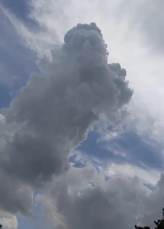 view of a cloudy sky. A large, grey cumulonimbus cloud dominates the scene, surrounded by other clouds and patches of blue sky. The tops of trees and a rooftop are visible at the bottom of the frame. A bird flies briefly across the lower portion of the cloud. The overall impression is of an overcast day.