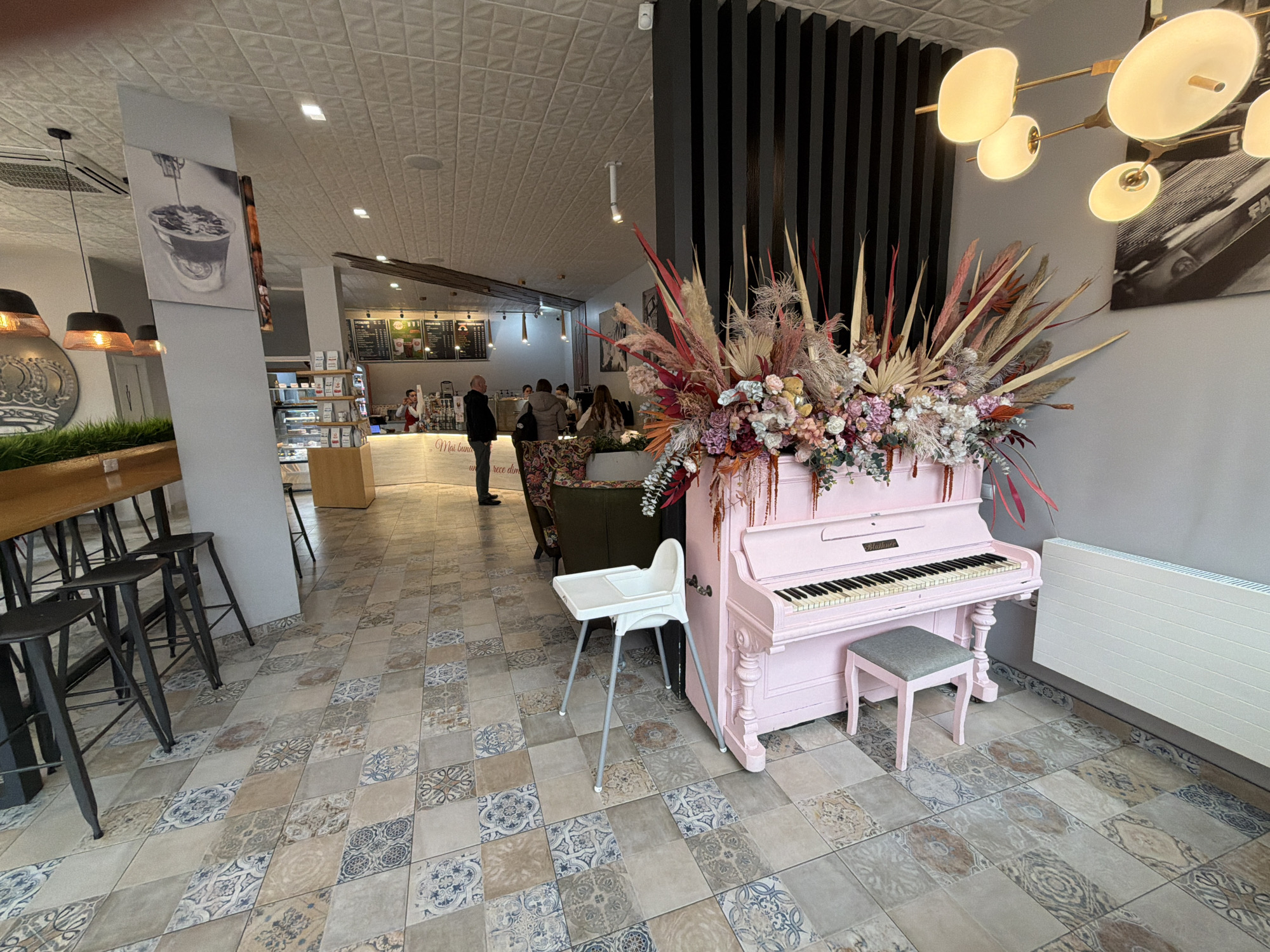 The image depicts the interior of a cafe located in Târgu Mureș, Romania. The floor is covered in patterned ceramic tiles featuring geometric and floral motifs in shades of beige, brown, grey, and blue. The ceiling is textured with a repeating diamond pattern and contains recessed lighting fixtures. In the mid-foreground, a pale pink upright piano with black and white keys stands against a light grey wall. A matching pink stool with a grey upholstered top is positioned in front of it. On top of the piano rests a large, elaborate floral and botanical arrangement composed of dried grasses, pampas reeds, and various artificial flowers in shades of pink, red, white, and beige. A white plastic high chair with silver legs is located to the immediate left of the piano. A white horizontal radiator is mounted on the lower portion of the wall to the right of the piano. To the left, a long wooden high-top bar table is accompanied by four dark grey metal bar stools. Behind this seating, a decorative wall panel features a large circular silver crown motif above a section of dark green artificial grass. In the mid-background, a service counter is visible, displaying menu boards with various beverages and food items, alongside refrigerated display cases. Approximately seven individuals are present within the cafe. One male, wearing a dark jacket, stands facing the counter, seemingly interacting with a female employee in a white shirt positioned behind the counter. Other patrons are observed seated in dark green upholstered armchairs or standing further within the establishment. Architectural details include a light grey pillar on the left adorned with a black and white image of a coffee drink. Behind the piano, a dark grey vertical slatted wall feature is visible. Another section of the grey wall displays a black and white photograph of a classic car, illuminated by a modern chandelier with multiple glowing oval diffusers and gold-toned arms.