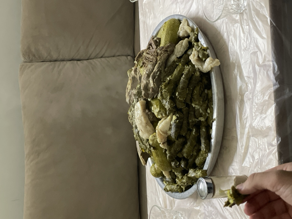 An overhead-angled photograph depicts a large, round metallic platter filled with a prepared meal, resting on a table covered by a clear, wrinkled plastic sheet. The main dish consists of a substantial quantity of cooked dark green, rice-ststuffed grape leaves (waraq enab), interspersed with several light green, rice-stuffed zucchinis (kousa mahshi). Various pieces of cooked meat, including bone-in cuts and fatty portions, are visible on top of and within the food mound, with faint steam rising, indicating heat. In the bottom left foreground, a light-skinned hand holds a small, irregular green object, consistent with a zucchini core. To the immediate left of the platter, a small, clear glass shaker with a metallic top, likely containing salt, is present. A clear glass cup with a textured pattern is visible behind the shaker, and another similar cup is partially visible on the right side of the frame. The background consists of a light beige or tan sofa with two visible cushions. The scene is located in Al-Qanawat Municipality, Syria.