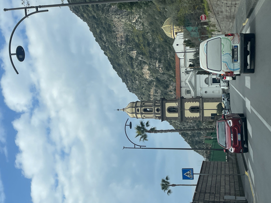 The image depicts a street scene in the city of Meta, Italy, under a partly cloudy sky. The foreground features a two-lane asphalt road with white lane markings and a crosswalk. A white panel van, with multi-colored wavy decals on its rear and Italian license plate "DX 073LR", occupies the right lane. A red compact SUV, with illuminated headlights and a partially visible Italian license plate "GD-934PN", is in the left lane, facing the viewer. Additional vehicles, including a white van marked "GLS", are visible further down the road. To the left, a black streetlight pole displays a blue pedestrian crossing sign. Two tall palm trees stand behind the streetlight. A prominent, multi-tiered bell tower, primarily ochre and dark brown with a domed, pointed cap and arched openings, dominates the midground. Adjacent to it is a white church building with a classical facade, including columns and a pediment. Further to the right and elevated, a building with a golden-yellow domed roof is visible. A red "STOP" sign is partially obscured on the right side of the road. The background is dominated by a large, steep, vegetation-covered mountain with exposed rock faces, rising immediately behind the urban structures.