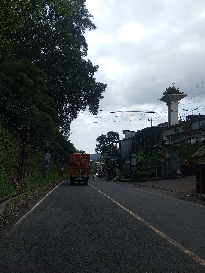 This image captures a street scene in Gubbisamamidi, India, on an overcast day. The perspective is from the center of a two-lane asphalt road, looking forward as it curves slightly uphill. A solid yellow line marks the road's center, and a white line delineates the right edge of the paved surface. On the left, a steep, densely vegetated embankment rises, covered in lush green foliage and large trees. Multiple utility poles run parallel to the road, supporting a complex network of dark electrical wires. A rectangular banner is affixed to one of these poles. In the middle ground, a dark truck, possibly a flatbed, occupies the right lane, moving away from the viewer. Its cargo area is filled with numerous stacked orange or reddish-brown crates. Further down the road, other vehicles are visible in the distance. On the right side of the road, a series of buildings are set into a hillside. A prominent white tower-like structure with a gold lotus-shaped top and a weather vane stands out against the sky. Below this, an entrance archway or gate is visible, with lettering partially discernible. Several individuals are seated on a bench or low wall near this entrance, observing the scene. Various commercial signs adorn the adjacent buildings. In the immediate foreground on the right, a small, dark wooden structure is present. The sky is largely covered by grey clouds.