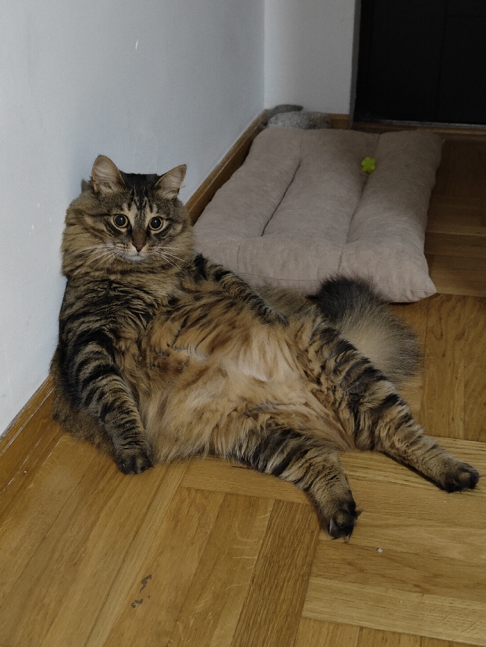 A long-haired, brown and black tabby cat with a prominent tan belly is observed seated upright on a light wooden floor, leaning against a white wall. The animal's front paws rest on the floor, and its hind legs are splayed outwards. Its gaze is directed forward. To the right of the cat, a light beige quilted pet bed is positioned against the wall, containing a small, bright green spherical object. A dark vertical structure is visible in the upper right background. A light-colored skirting board lines the base of the wall. The scene is located within an interior space in Boreti, Montenegro.