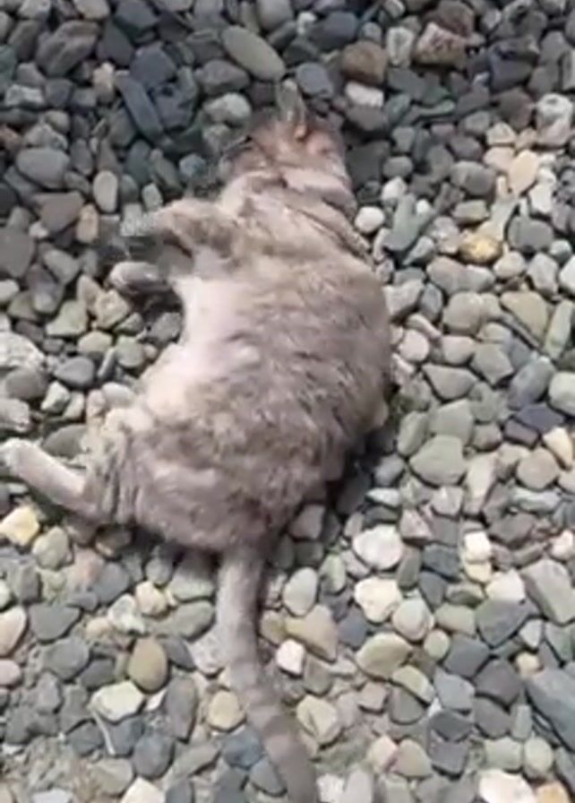A gray tabby cat wearing an orange collar rolls around on a bed of gravel in full sunlight. The camera angle is high, looking straight down.