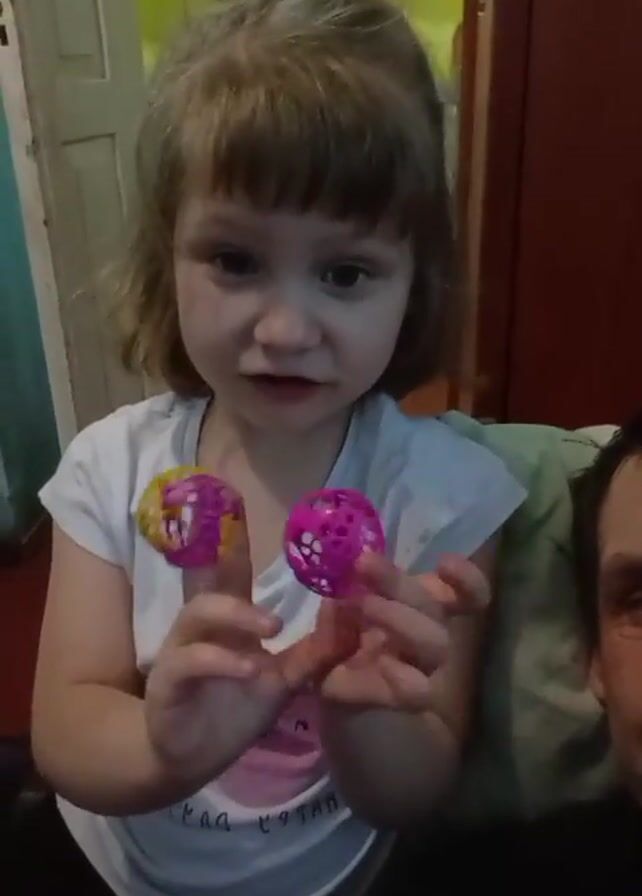 A young girl with short brown hair and bangs is holding two spherical toys in her hands, one yellow and one pink